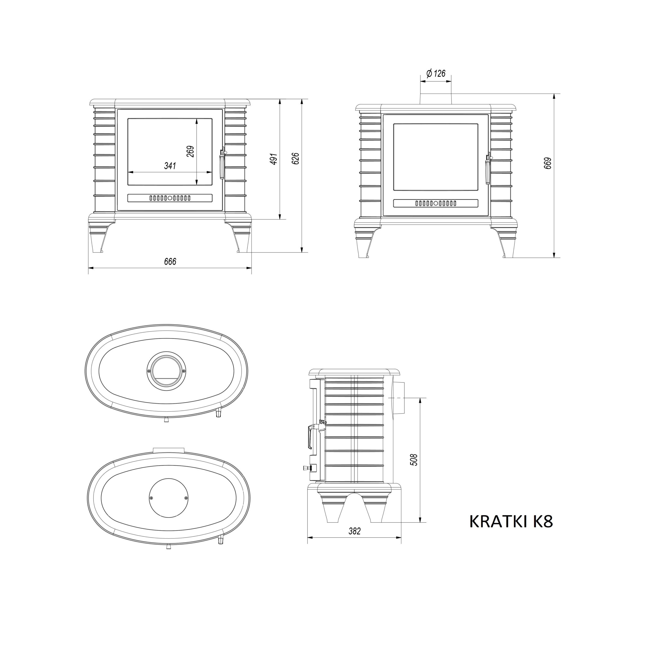 The K8 features an industrial design, with rounded lines and an elongated, oval stove body. It has a large glass window and a cast iron stove body with a minimum wall thickness of 8 mm.
