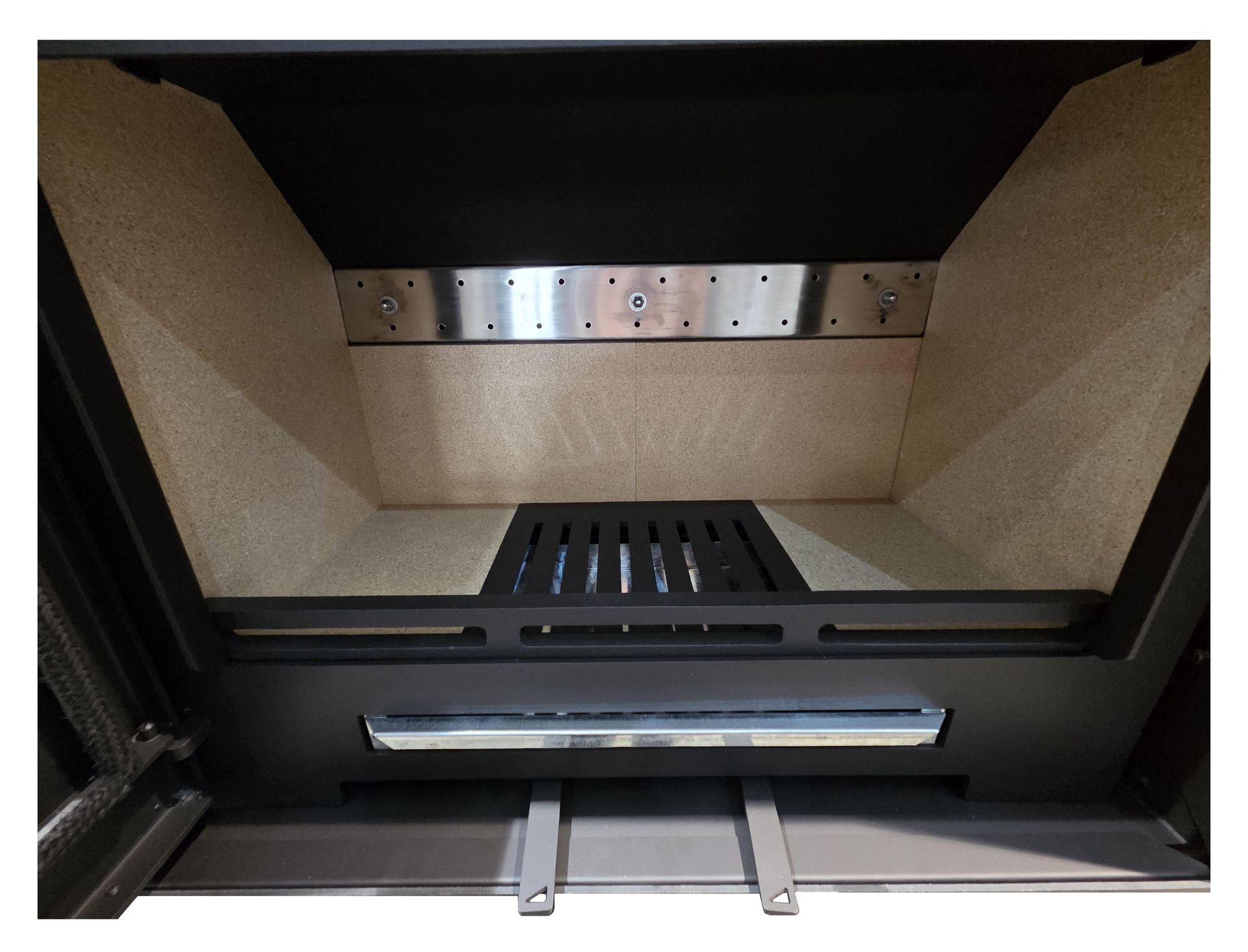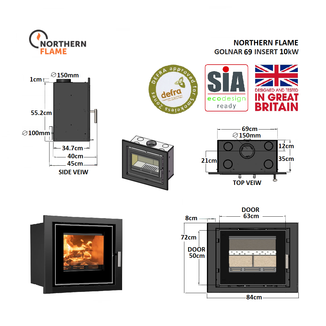 The Golnar 69 Insert is an Eco-design ready, wood-burning fireplace that combines modern style with high-efficiency performance. Its door features a large glass window framed by a thin, silver, steel border offering an elegant view of the flames.