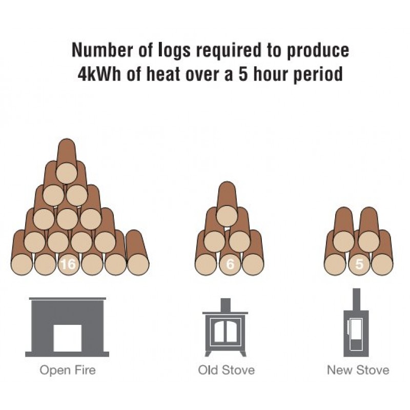 The Hampton Vista 500 Oval is a very efficient and up-to date fireplace. Its tall, oval design boasts a large window in a stylishly shaped, 30mm thick, cast-iron door. It has an integrated heat shield and can be installed closer to combustibles that other fireplaces (10cm at the rear and 20cm at the sides when a twin walled flue is fitted directly to the fireplace). It’s perfect for installations against a wall, and for corner installations. It comes with an ergonomic handle that tucks into its design below the door, and an integrated log stand.