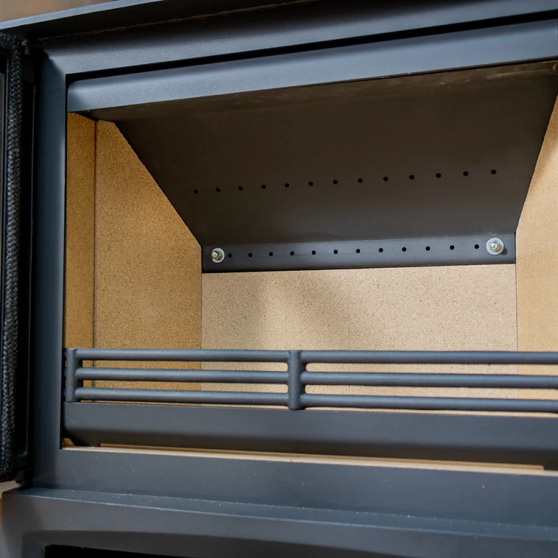 The Hampton Vista 900 is one of the most up-to date fireplaces on the market. Its modern design boasts a large window in a stylishly shaped, 30mm thick, cast-iron door that is mirrored with a matching, thick, cast-iron fascia fixed to the integrated log stand. It comes with a newly designed, brushed chrome, push/pull handle, and a chrome dial.