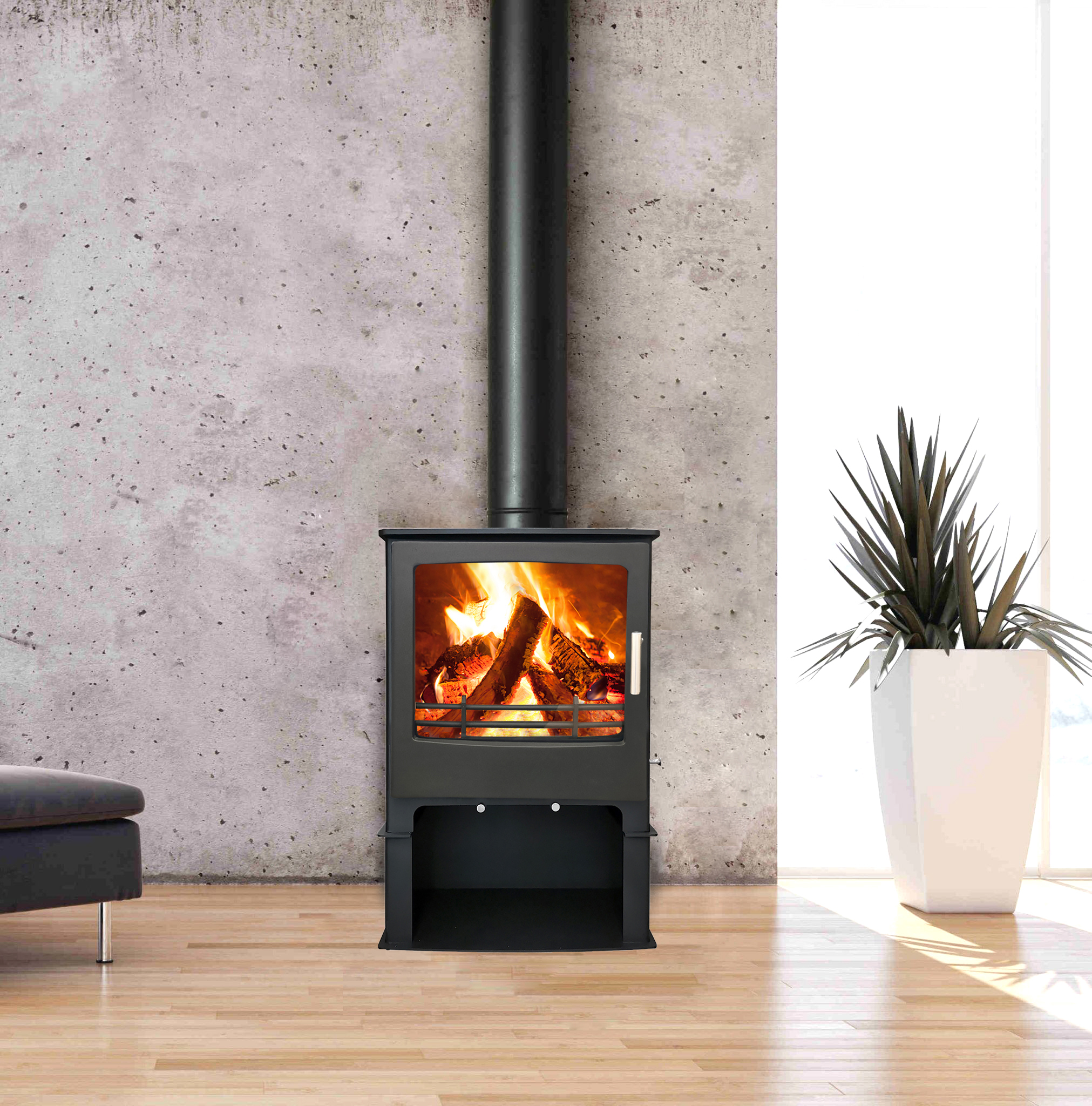 The Sentinel Ottawa Square 8 with Log Stand is a compact freestanding multi-fuel fireplace with a clean-lined design that suits more contemporary interiors. The log-stand base gives the unit extra visual height and makes it feel more like a built piece within the room, while still keeping a relatively compact footprint.