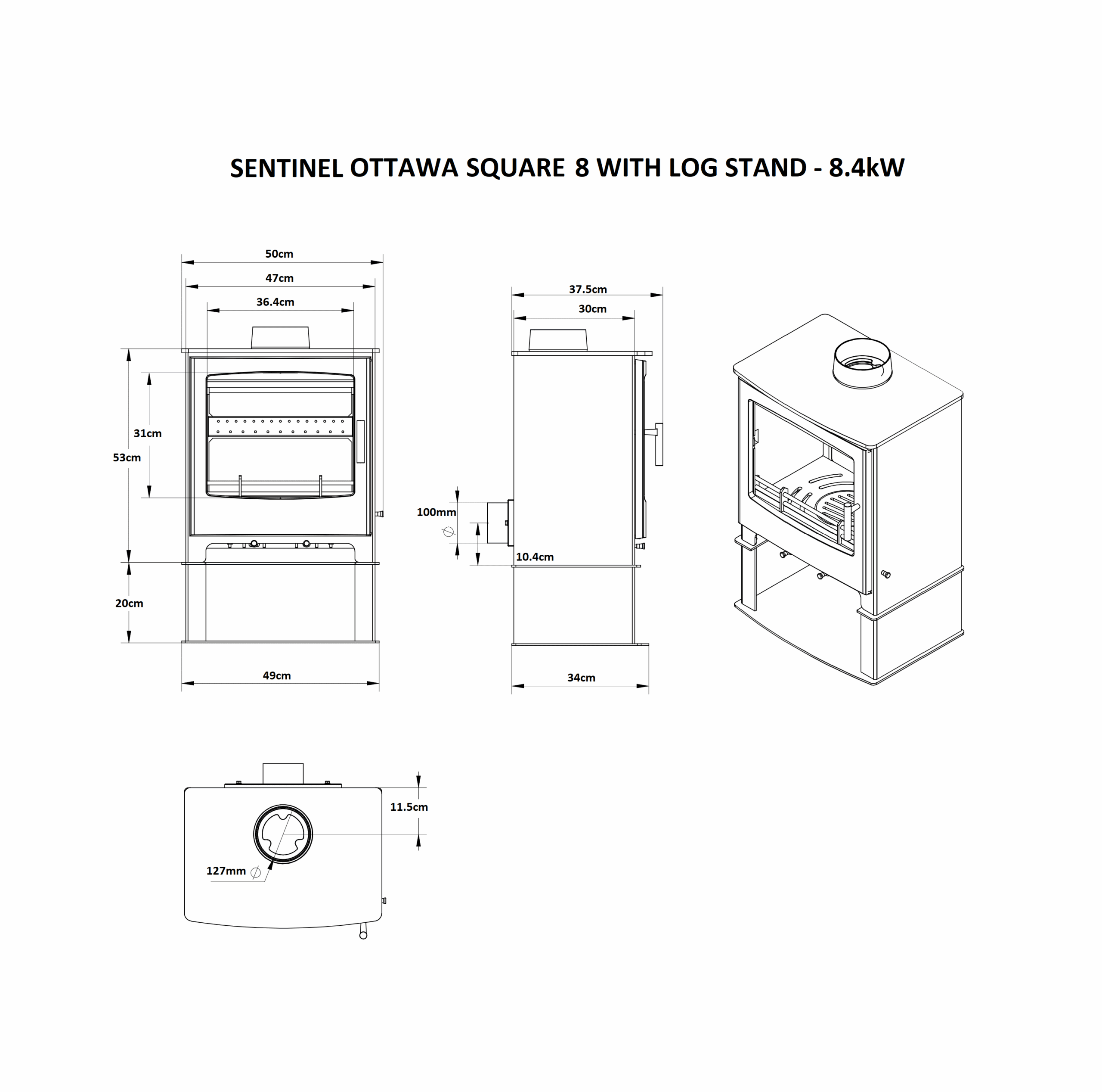 Sentinel Ottawa Square 8 with Log Stand freestanding fireplace with 8.4kW output, cast iron / steel construction, multi fuel performance, and a practical heating design.